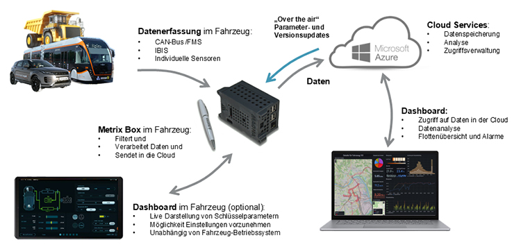Die Metrix-Box zeichnet Rohdaten permanent auf, verarbeitet sie lokal und leitet sie über WLAN oder LTE an eine Cloud-Datenbank auf Basis von Microsoft Azure weiter. Die Daten werden gespeichert und für die Analyse in Flottenmanagement-Tools und grafischen Dashboards aufbereitet. Auswertungen können über beliebige Zeiträume in der Vergangenheit vorgenommen werden.
