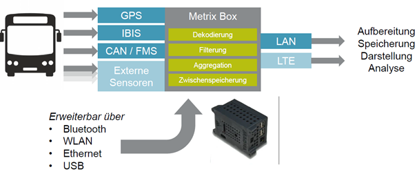 Die Daten von GPS, CAN, FMS, IBIS und weiteren Sensoren werden in der Metrix-Box erfasst und für die Weiterverarbeitung vorbereitet.