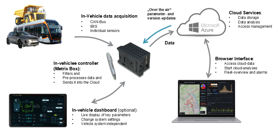 The Metrix box continuously records raw data, processes it locally, and transmits it via WLAN or LTE to a cloud database based on Microsoft Azure. The data is stored and prepared for analysis in fleet management tools and graphical dashboards. Evaluations can be performed over any period in the past.