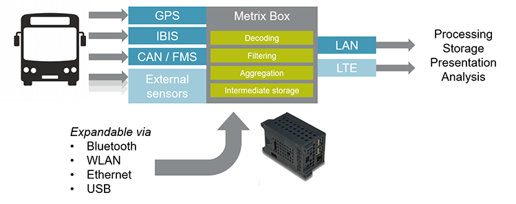 Data from GPS, CAN, FMS, IBIS, and additional sensors are collected in the Metrix box and prepared for further processing.